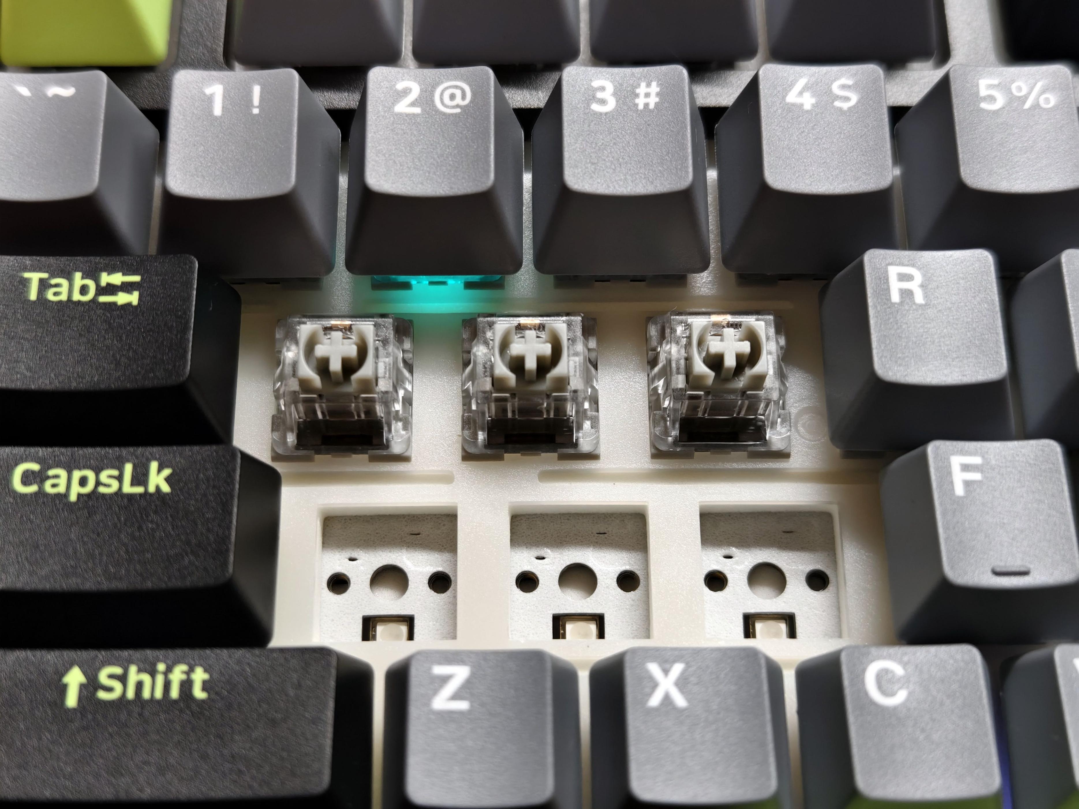 支持全键热插拔,5脚轴座兼容市面上大部分轴体,3针或者5针轴体都能适配,想换青轴就换青轴,想换茶轴就换茶轴。