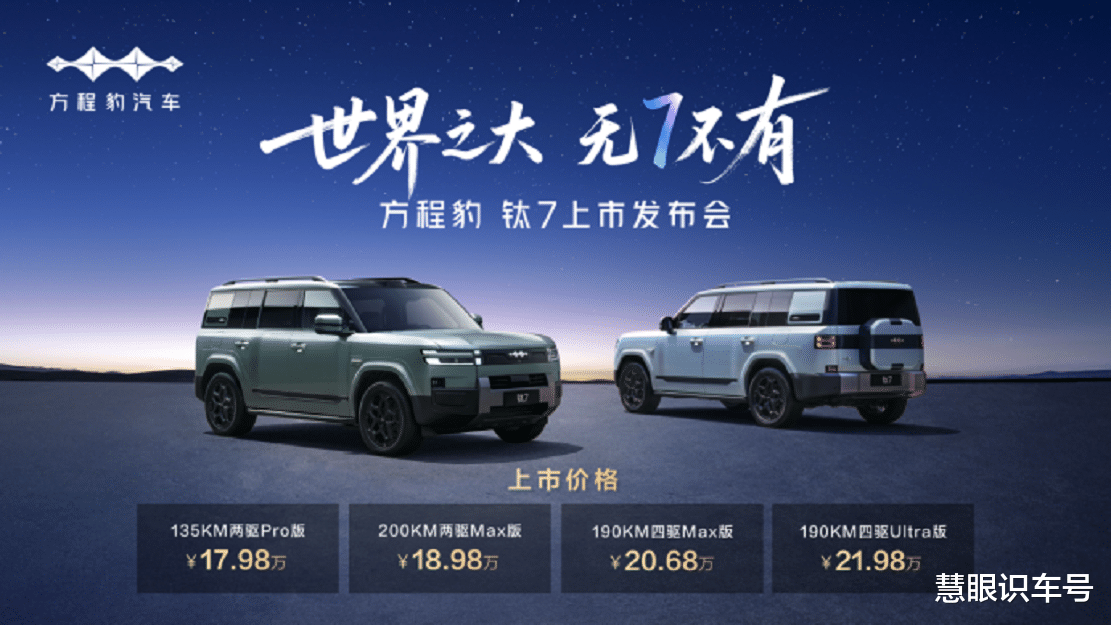 9月9日,比亚迪最新开创之作“大五座天花板”——方程豹钛7正式上市,新车共推出4个配置版本,售价17.98万元-21.98万元:其中,135KM两驱Pro版17.98万元,200KM两驱Max版18.98万元,190KM四驱Max版20.68万元,190KM四驱Ultra版21.98万元,款款越级,款款超值,下单即刻享受最高价值超3.6万元的上市权益。