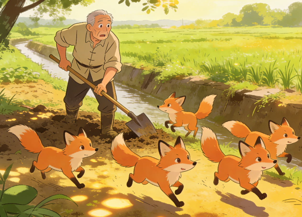 早晨起来,觉得这个梦有些奇怪,也没细想,吃完早饭就匆匆地去地里劳作,劳作地点在我老家和邻村之间的沟边,路上突然看见了许多小狐狸。他心想:今天肯定有收获。拿起锄头就把小狐狸打伤了,当他正准备再捉几只好去分享他的战利品的时候,刮来一阵旋风,他就晕了过去。