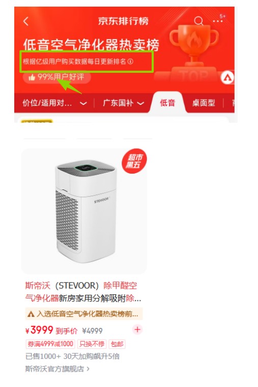 静音节能: 最低运行噪音仅28.5dB,犹如耳边轻语,不会打扰睡眠。最大功率仅82.1W,非常节能省电,获得京东平台的京东排行榜-低音空气净化器热卖榜,该排行榜根据亿级用户购买数据每日更新排名,99%用户好评推荐。