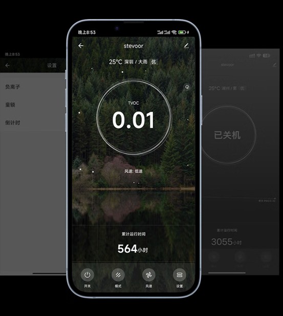 智能互联: 支持APP远程监控,可实时查看家中空气质量(包括TVOC和甲醛数值显示),远程开关机、调节风速,随时随地管理家中空气。