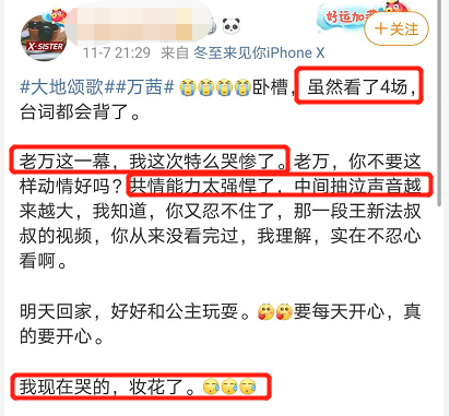 2020年,万茜出演了大型史诗歌舞剧《大地颂歌》,将扶贫楷模王婷的事迹演绎得令人潸然泪下。当成为王婷的万茜在舞台上哭成泪人时,台下的观众也跟着落了泪。甚至有观众连追4场,因为现场的感染力太强了。