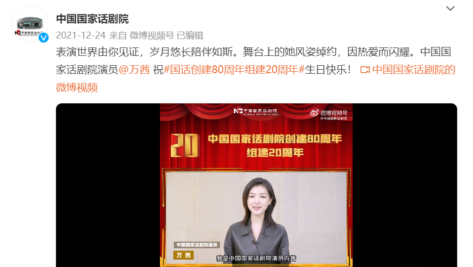 2021年12月25日,中国国家话剧院迎来创建80周年、组建20周年纪念日。为持续振兴中国话剧事业,为话剧的发展注入新鲜血液,演员万茜、关晓彤、张桐等25人作为高端人才被引进,并多了一个全新的身份:中国国家话剧院演员。