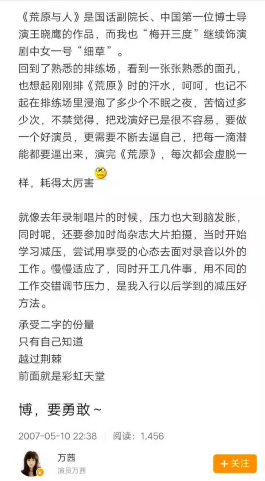 都说台上一分钟,台下十年功。为了呈现让自己满意的舞台效果,万茜在台下没少和自己较劲。在万茜2007年的博文中,不难看到她内心对舞台的一种坚持。如果不是非要演好戏,大概是不会去逼自己,不会每演一次就“虚脱”一次的。