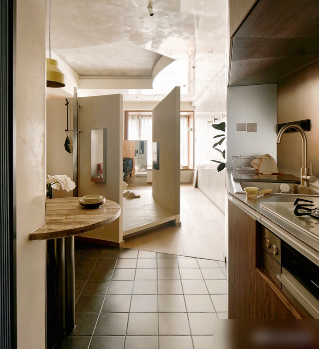 第三步:功能叠加——1㎡当5㎡用小户型的终极考验,是“功能齐全”。Allen的厨房虽小,却把洗衣机、洗碗机都嵌进柜体;餐厅用定制大理石圆桌+矮墙屏风,既是用餐区也是刷剧区;客厅沙发背面做储物柜,扶手边藏下翻梳妆镜柜——这些设计完美契合“多功能家具”的改造秘诀。更妙的是休闲区:用橡木装饰四面墙,既当临时睡房又当阅读角,把“垂直空间革命”玩到了极致。