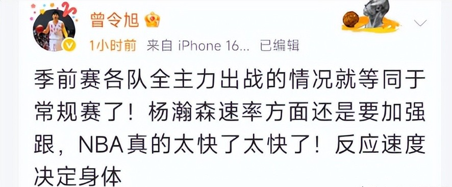 北京时间10月9日,中国球员杨瀚森迎来了NBA首秀,本场比赛杨瀚森与库里、巴特勒、格林同场竞技,全场比赛杨瀚森出战21分13秒,得到4分4个篮板,拼到6犯离场,最终勇士129-123逆转开拓者,赛后专家曾令旭直接说出了杨瀚森的不足,小杨在NBA想立足还有很长的路要走!