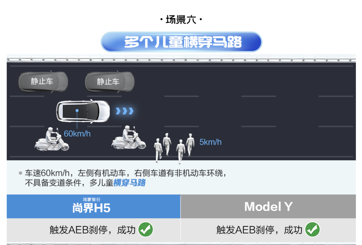 另一大高难度测试项目,多儿童横穿的“鬼探头”场景,更能考验辅助驾驶系统的应急反应能力。测试设定为城区道路,车辆以60km/h正常行驶,突然有4名“儿童”横穿马路,且车辆左侧有同向机动车、右侧有非机动车行驶,完全不具备变道避让的条件。华为乾崑智驾ADS 4系统迅速触发AEB自动紧急制动功能,精准控制刹车力度,最终将车辆稳稳停在安全距离内,成功避免碰撞风险。