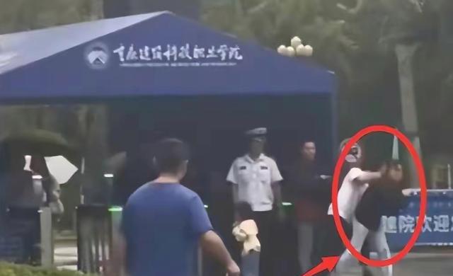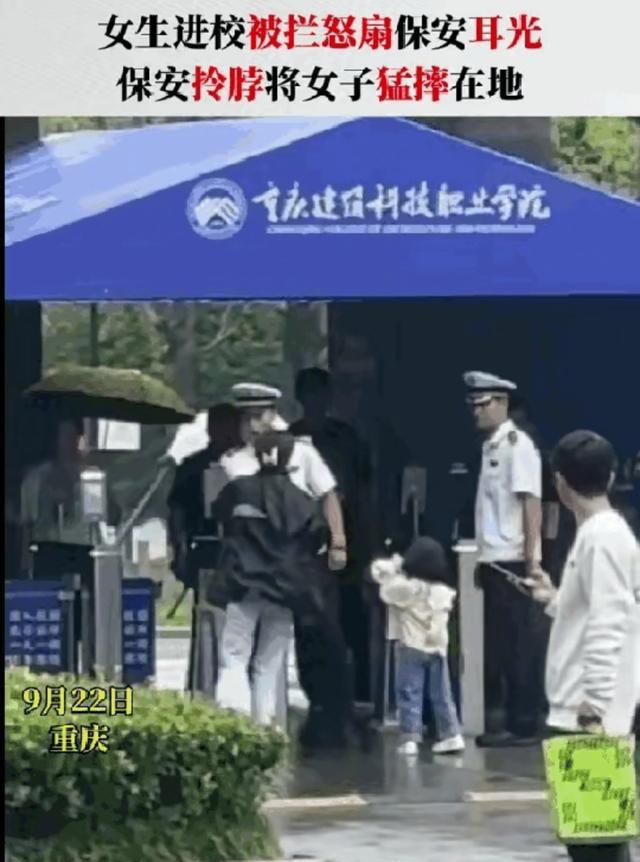 重庆一位穿着黑衣女子来到某职业院校门口,她还带着一个六七岁的小女孩,开始时候,黑衣女走到门口对保安说:你好,我找个人,麻烦让我进去一下。