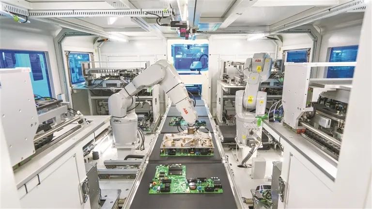 △视源智造基地的产线机械臂正在生产板卡