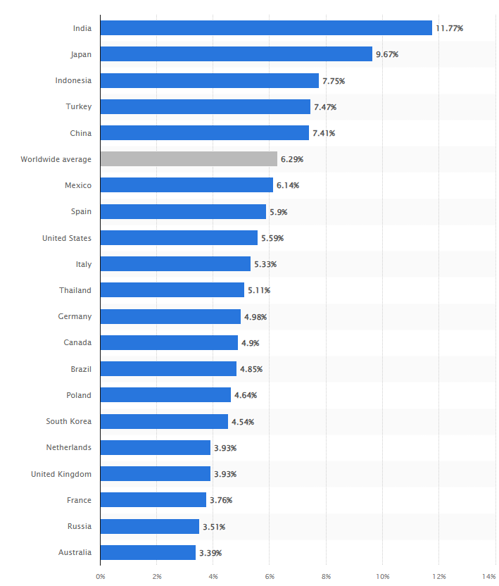 2025 年至 2030 年各国零售电子商务销售额复合年增长率(CAGR)(图片来源:Statista)