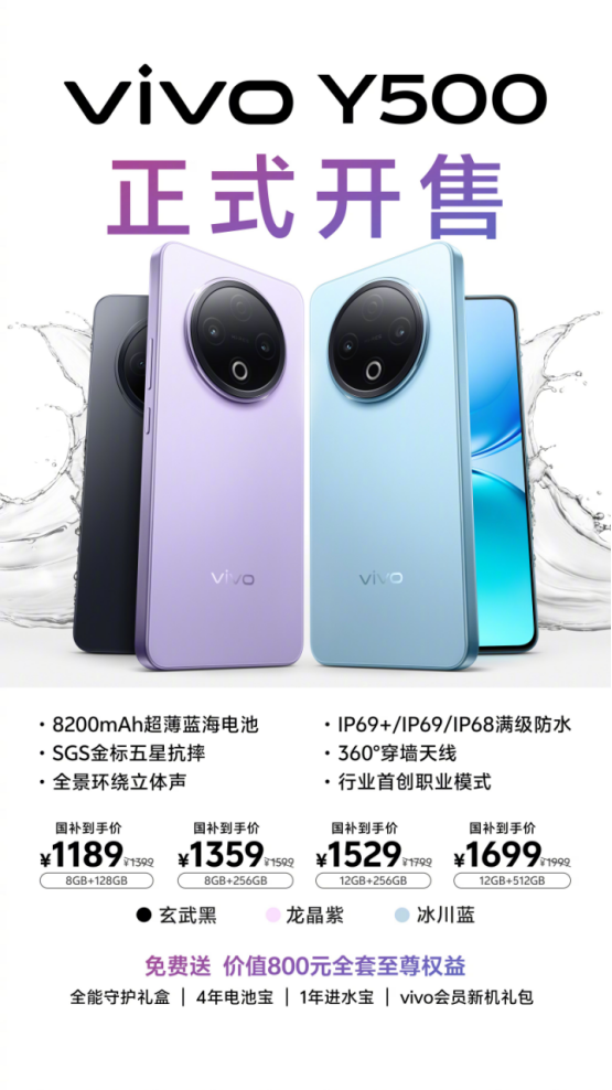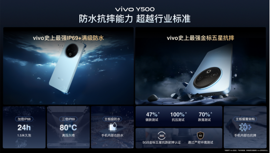 耐用性方面,vivo Y500堪称“坚固可靠”。IP69+满级防水能力,让户外溯溪、赶海,甚至意外落水时,只需将手机捞起擦干,就能正常使用;机身采用金刚磐石架构,通过多项严苛跌落测试,并拿下SGS五星抗摔认证,日常工作或旅行中的手滑摔碰,几乎不会对手机造成损坏,彻底打消用户对设备损耗的顾虑。