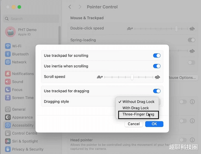 传统的按住拖拽很累,我们可以在 系统设置 → 无障碍 → 指针控制 → 触控板选项 里启用三指拖拽,启用后窗口的拖动会被三指滑动所取代,上手有点怪但一旦适应就很顺手;
