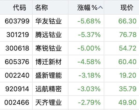 金属方面,华友钴业、腾远钴业、寒锐钴业、天齐锂业等集体走低。