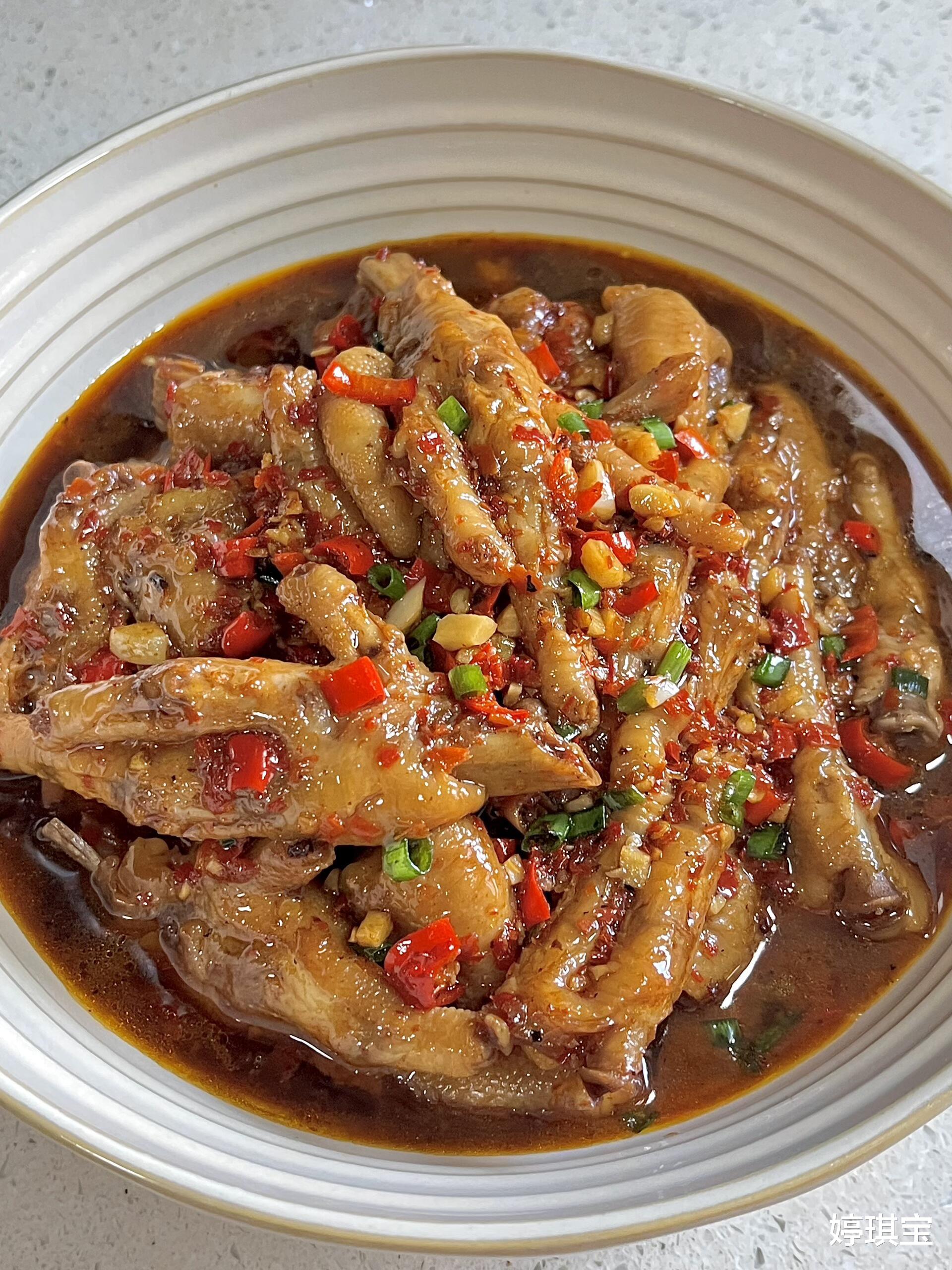 开大火收汁,撒上小米椒碎和葱花。看!红亮油润的鸡爪裹着浓稠的辣汁,让人直咽口水~