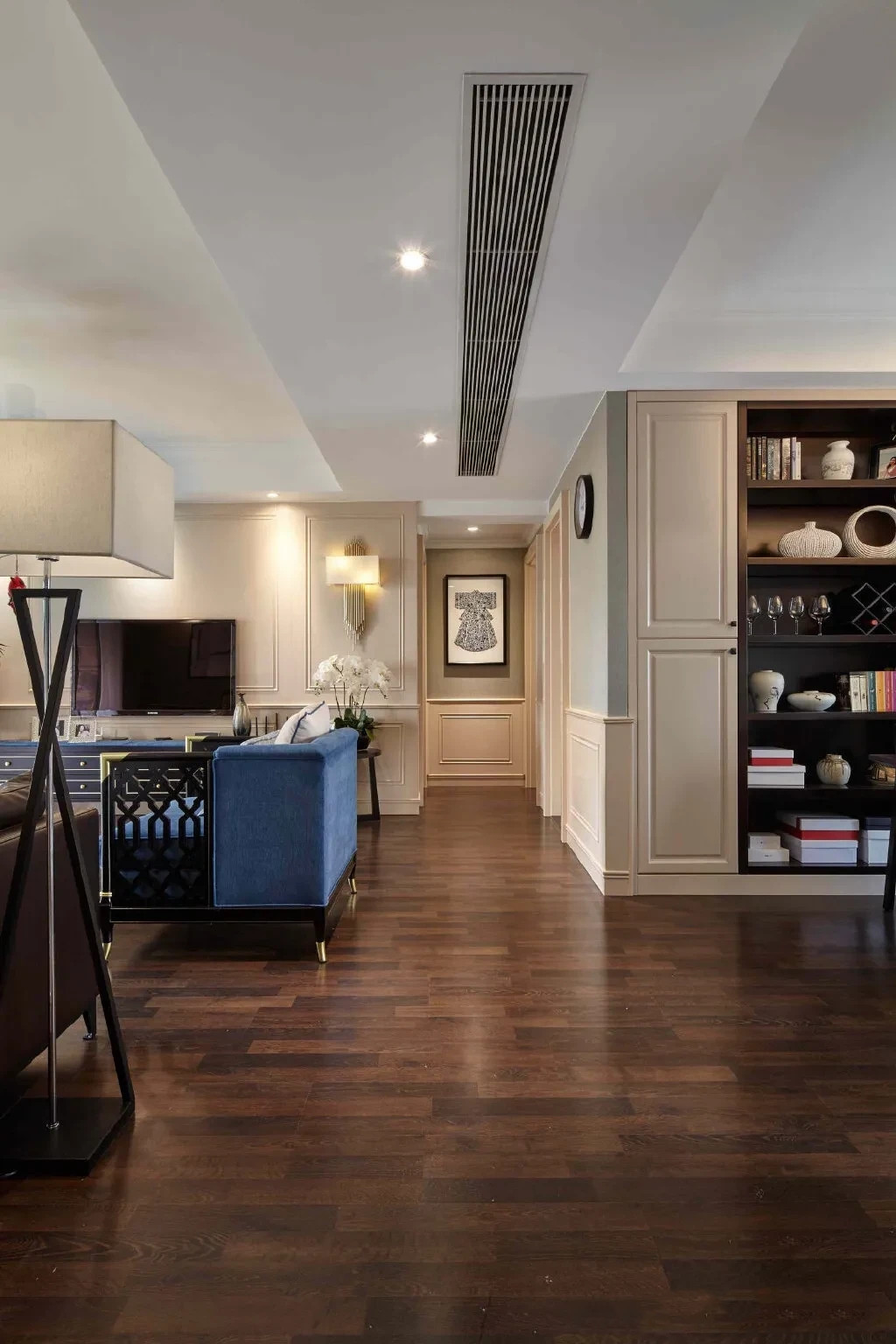 全屋实木的地板让人觉得温馨舒适,而且是室内的墙面整体做了美式元素的设计,搭配起来就十分的好看和温馨了,搭配中式风的家具装饰,让人更加的向往,比如走廊的尽头,上方就是一幅中式风的古代艺术画,真好看。