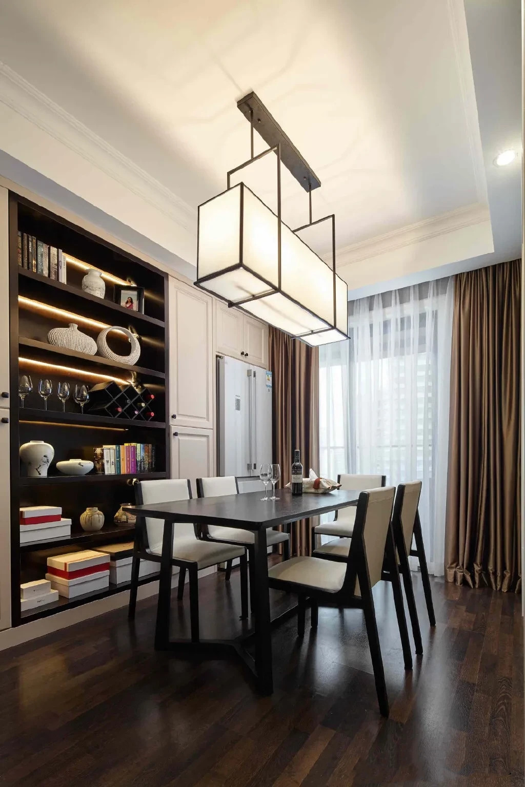 中式风的整套餐桌椅直接放在餐厅的中间,餐厅带有个阳台,作为日常的生活阳台。而餐边柜的装饰,定制的餐边柜实用又大气,多功能的柜子设计不仅有酒柜,展示柜,收纳柜,甚至还给冰箱的位置一个大空间。整体感非常强。