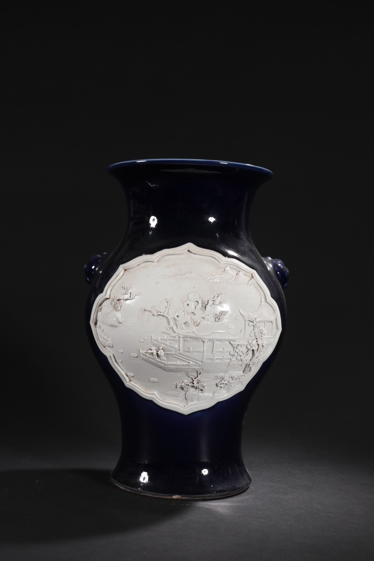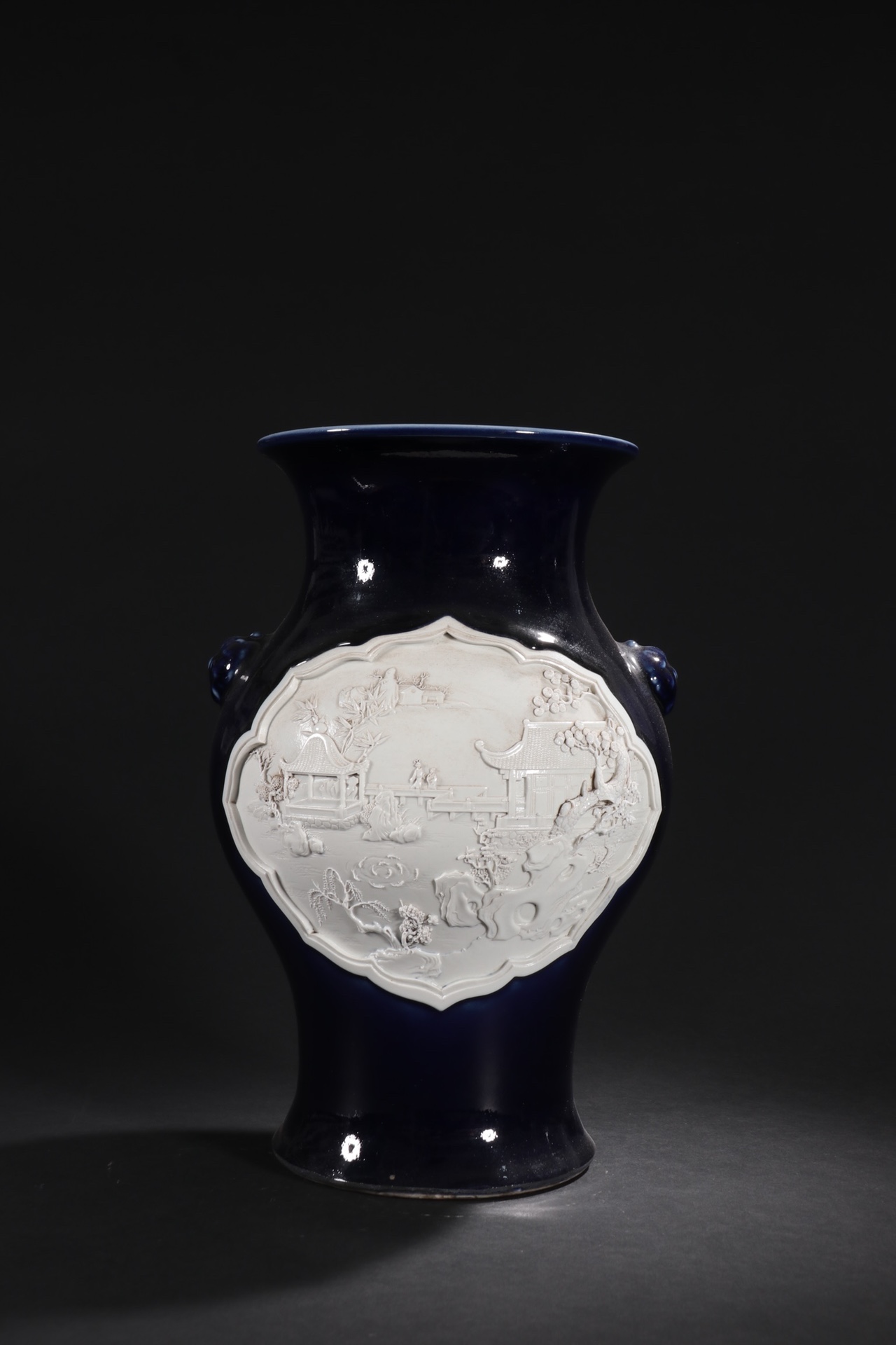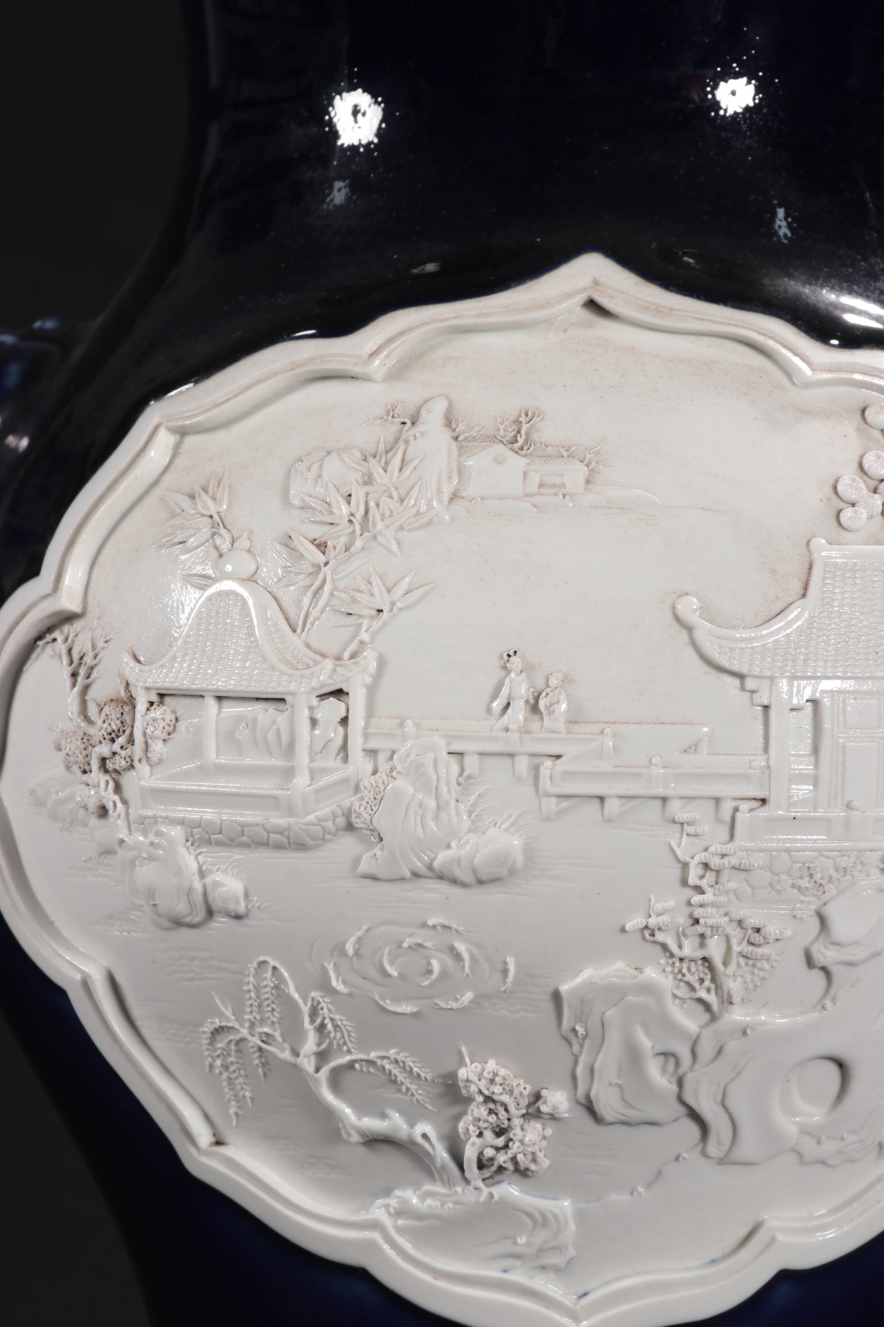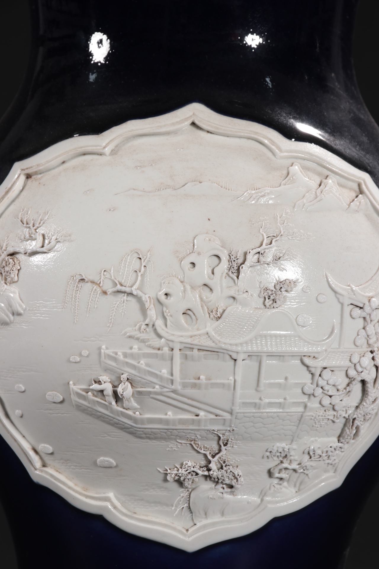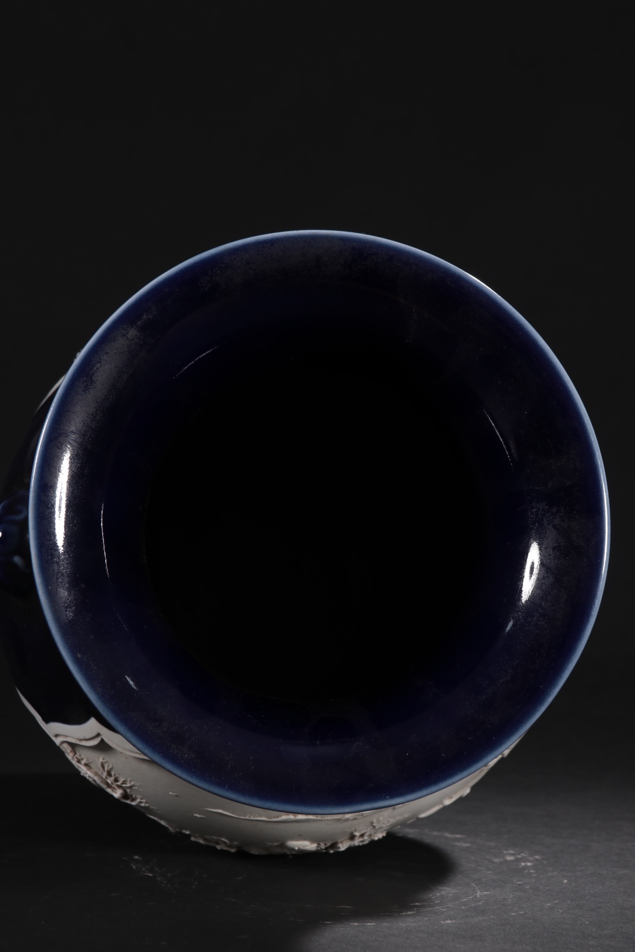 王炳荣款-宝石蓝釉开窗“人物故事”双耳瓶 规格:高32cm口径17cm 器型规整,包浆均匀厚重,整体施釉均匀饱满,釉色肥厚,釉面莹润光滑,修足爽利,胎质油糯,器开窗堆塑人物故事图案,栩栩如生,雕工精湛,收藏文房陈设佳。全品!