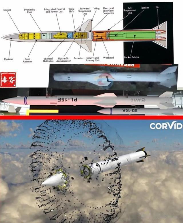 霹雳-15的杀伤部集中在前中部,这里储备了大量的杀伤性破片,而导弹的最前半部则是导引头,霹雳-15在工作中会连同导引头爆炸,剩下的中后部则会完全抛弃,这也是印度发现的霹雳-15导弹看起来长度不够的原因。
