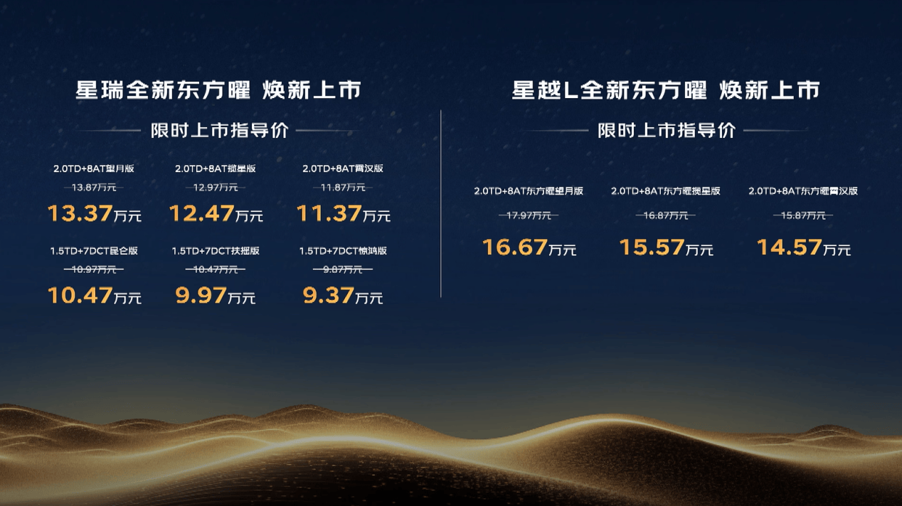 吉利中国星全新东方曜系列于2025年9月23日正式上市,限时指导价9.37万元起,星瑞和星越L双车齐发,成为燃油车的豪华标准。星瑞全新东方曜提供两种动力组合共六个版本,星越L全新东方曜则推出三款车型。购车用户即日起可参与抽奖活动,每月300名幸运用户获赠定制款MEIZU 22手机。