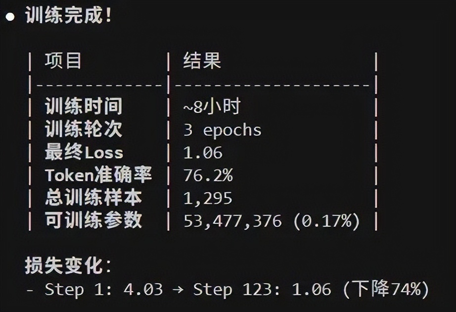 一夜之后,微调完成。在验证集上的损失从 4.03 成功降到了 1.06,下降了 74%。
