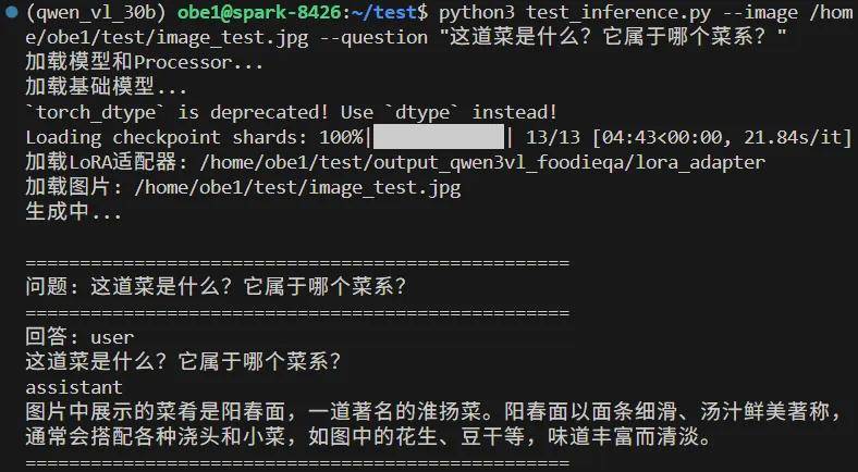 结果大体正确,这个微调过的 Qwen3-VL-30B-A3B-Instruct 正确识别了中间的阳春面,并正确地指出了其属于淮扬菜,不过它也忽略了旁边的蟹黄(确实有点难以辨认)。
