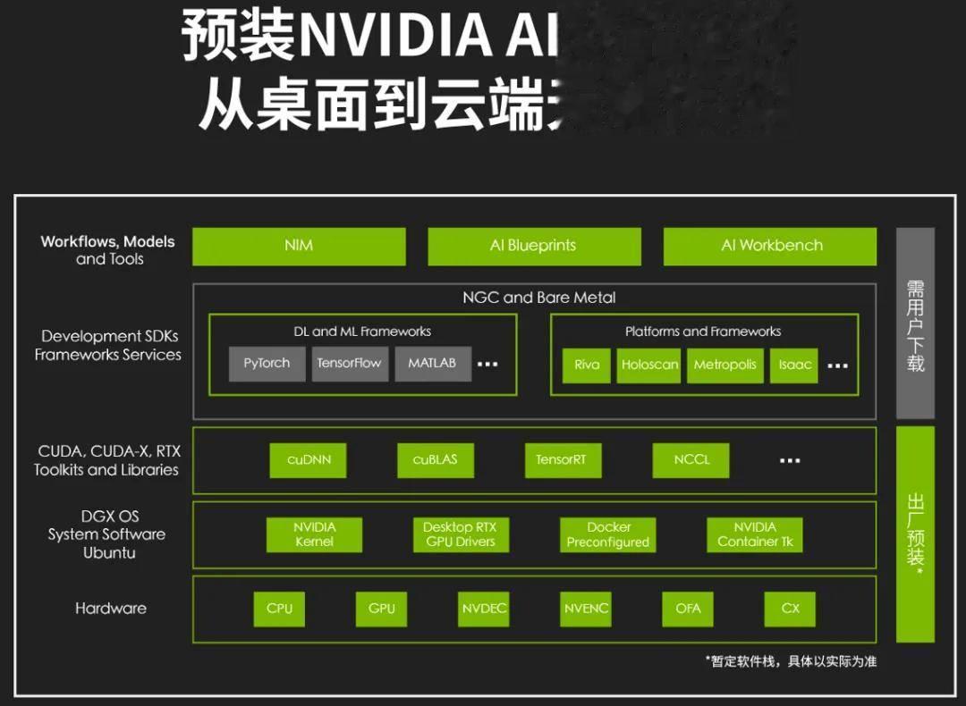 更关键的是,它是一台「原生」的 AI 机器。预装了 NVIDIA AI 软件栈,底层运行的是开发者熟悉的 Linux 系统,跑的是最纯正的 CUDA 环境。