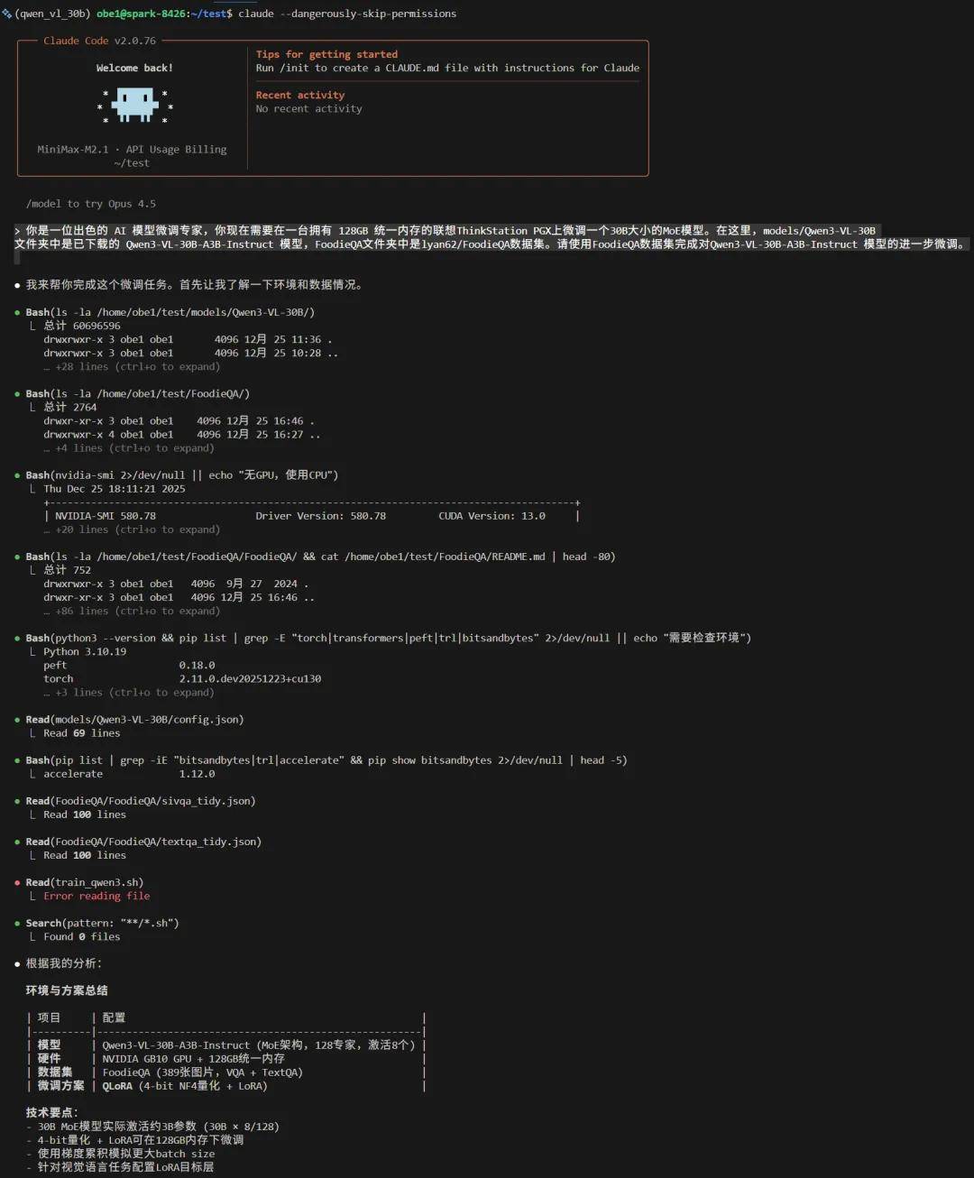 你是一位出色的 AI 模型微调专家,你现在需要在一台拥有 128GB 统一内存的联想 ThinkStation PGX 上微调一个 30B 大小的 MoE 模型。在这里,models/Qwen3-VL-30B 文件夹中是已下载的 Qwen3-VL-30B-A3B-Instruct 模型,FoodieQA 文件夹中是 lyan62/FoodieQA 数据集。请使用 FoodieQA 数据集完成对 Qwen3-VL-30B-A3B-Instruct 模型的进一步微调。