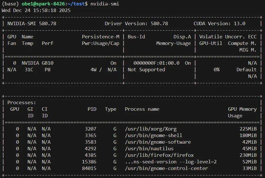 在终端输入 nvidia-smi,可以看到显卡型号是 NVIDIA GB10,CUDA 版本为 13.0。但这里有一个有趣的细节:在 Memory-Usage 一栏,它显示的是 Not Supported。