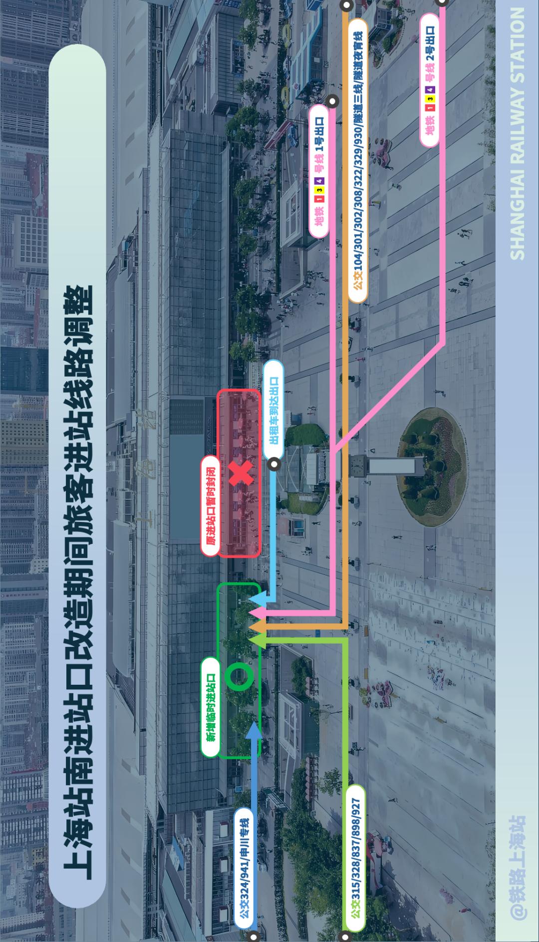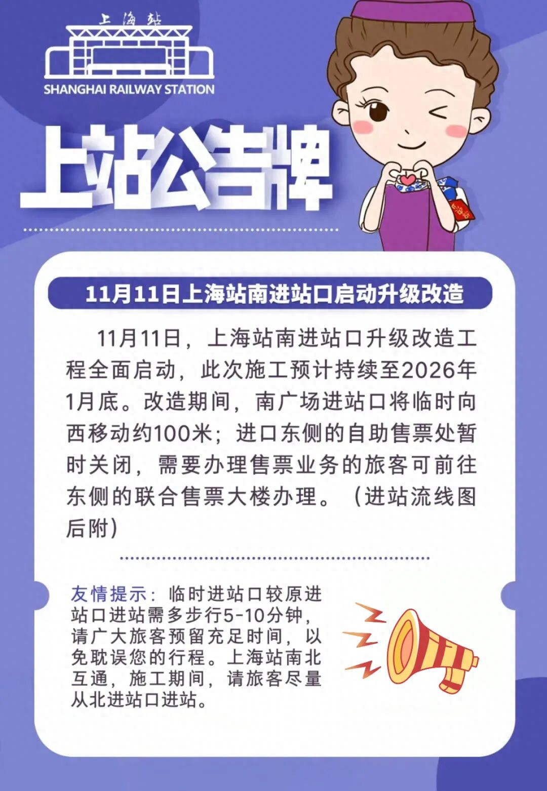 铁路部门提醒广大旅客,南进站口改造期间,临时进站口较原进站口需多步行约5-10分钟,请广大旅客预留充足时间,以免耽误您的行程;进口东侧自助售票处暂时关闭,需要办理售票业务的旅客可前往联合售票大楼办理。上海站站房结构南北互通,两边均可进站上车。今年初,北进站口刚刚完成扩容改造,安检通道由原先的5个增至8个,南进站口改造期间,建议广大旅客尽量选择从北进站口进站。
