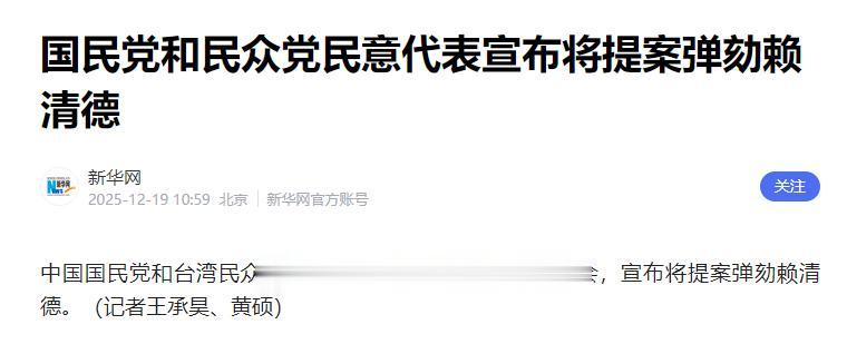 12月19日,两党正式宣布,将向相关机构递交对赖清德的弹劾提案,矛头直指这位上台仅一年半的岛内领导人。