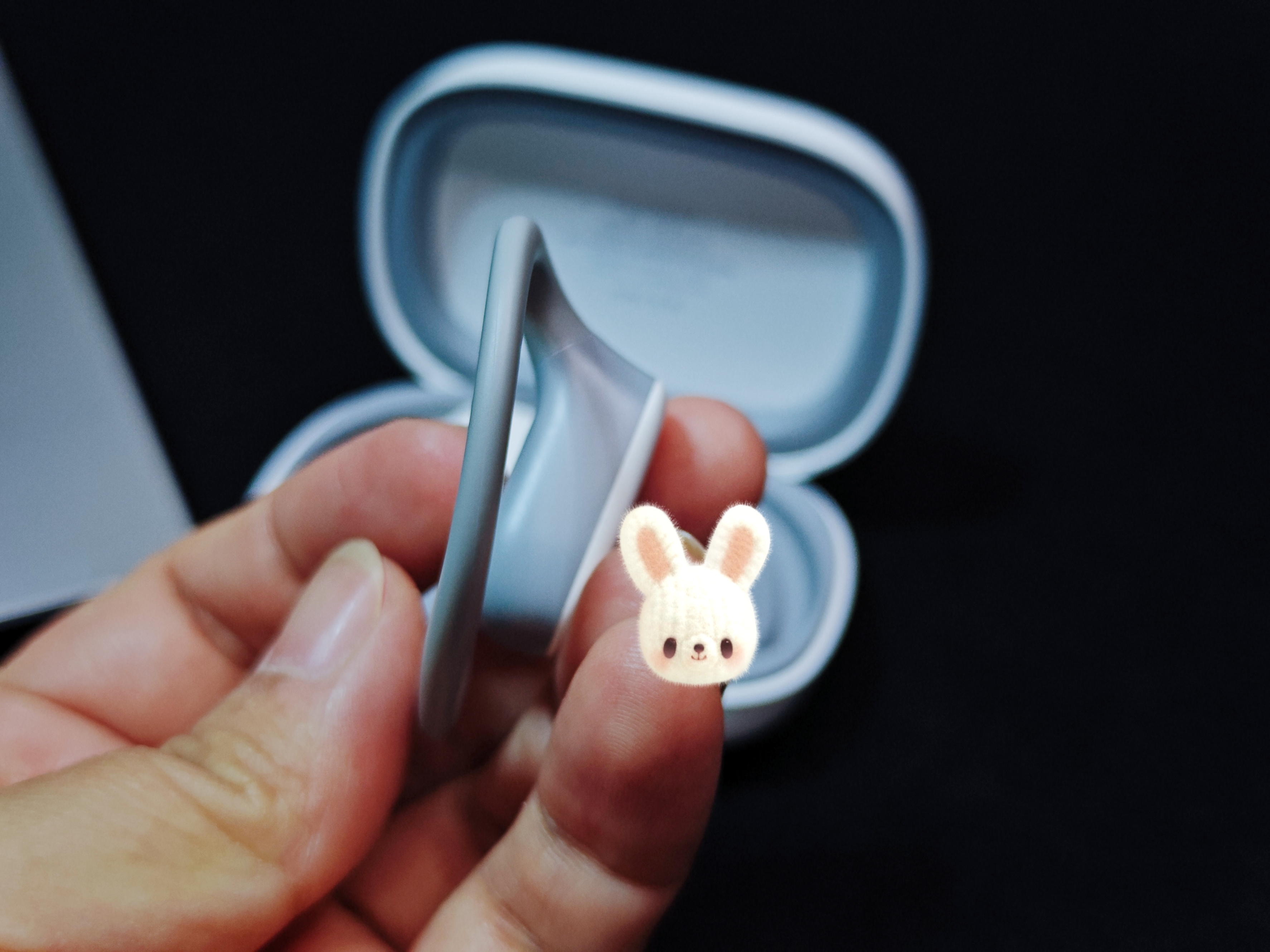 掀开盒盖,两枚耳机以磁吸方式固定在凹槽内,取出时能感受到恰到好处的吸附力。耳机本体采用哑光材质,耳挂处覆盖着婴儿奶嘴级硅胶,柔韧亲肤。