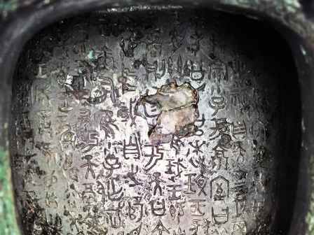 如果说造型与纹饰是何尊的“外在美”,那么内底的铭文就是它的“灵魂”。1975年,在筹备全国新出土文物精品展时,工作人员对何尊进行除锈清理,意外发现其内壁底部刻有12行共122字的铭文。这篇铭文不仅字迹清晰、书法古朴,更记载了重要的历史事件,其中最核心的便是“中国”二字的首次实物出现。