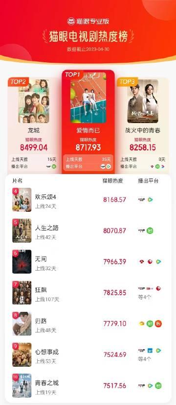 4月30日猫眼电视剧热度榜TOP10:《战火中的青春》跌至第三,你在追哪一部? 冠军:腾讯视频 播出 吴磊,周雨彤 等主演 猫眼昨日热度值8717.93 亚军:爱奇艺 播出 马伊琍,白宇 领衔主演 猫眼昨日热度值8499.04 季军:爱奇艺,优酷 播出 王鹤棣,周也,叶祖新,胡连馨 领衔主演 猫眼昨日热度值8258.15 第4名:欢乐颂4 第5名:人生之路 第6名:无间 第7名:狂飙 第8名:归路 第9名:心想事成 第10名:青春之城 圆头君今日点评:《战火中的青春》这部剧几乎每一集我都在哭,这种哽咽与流下的眼泪是对当时国家处于水深火热之时政府的无力抗衡与初期的无所作为的无力与愤怒,是看到那些年轻学生们一心想要报国、将生死置之度外的感动与震撼,是对当时每一个为教育香火能延续下去做出选择与努力并且始终与同学们同在的教授学者!诚然,这是一段非常痛的历史,但是再痛我们也要去触碰,去了解,去传承,去讲述!