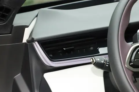 再看马自达 EZ-60,它的内饰胜在 “质感和氛围”,走的是精致路线。虽然 Air + 版本没有顶配的紫色内饰,但整体做工扎实,细节处的缝线工整均匀,材质触感细腻,符合合资品牌的水准,摸上去觉得有质感。吸引人的就是它的 26.45 英寸大屏,看着有冲击力,搭配水晶氛围灯,晚上开车的时候,氛围灯慢慢亮起,整个车内的格调上来了,氛围感拉满,尤其是和朋友一起开车出去,有面儿。