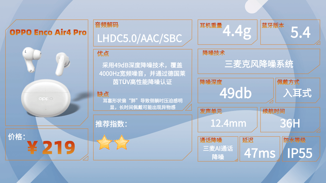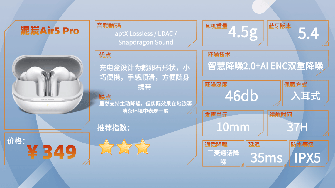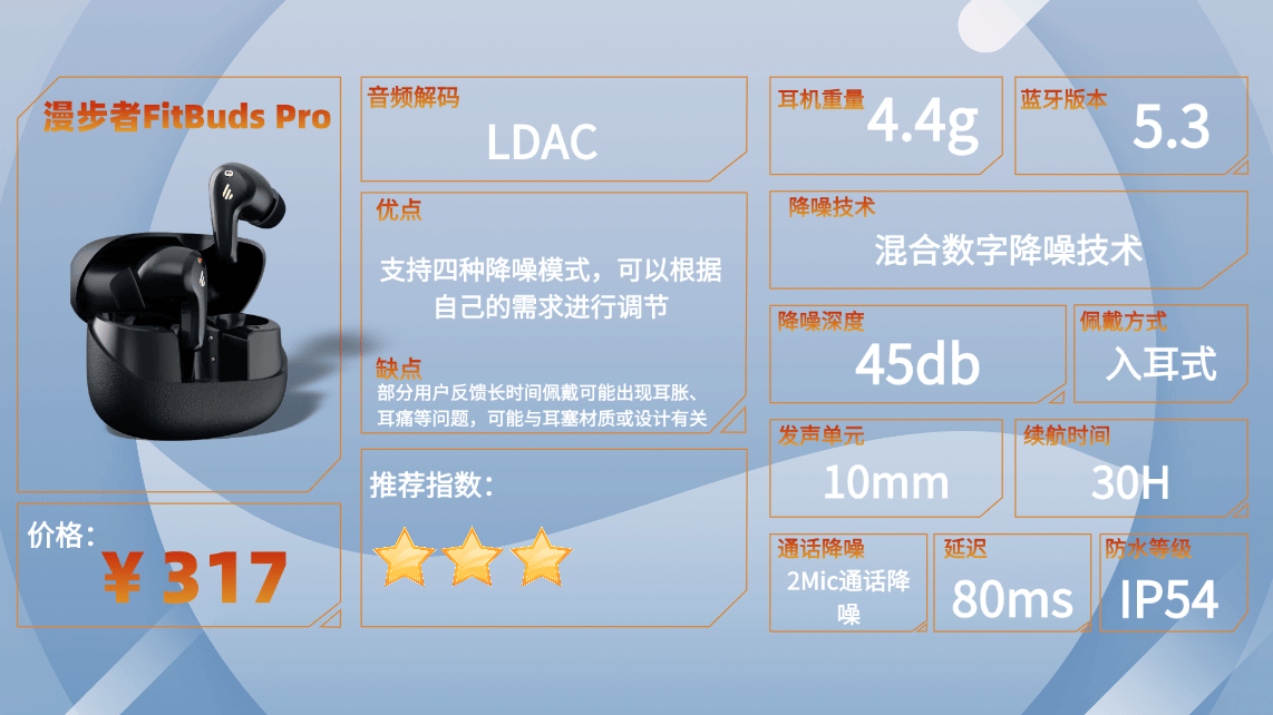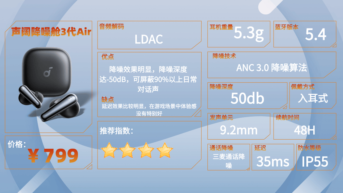 推荐原因:这款耳机在舒适度方面表现不错,单边只有4.5g,佩戴时几乎感受不到重量。对于经常通勤或者长时间办公的人来说,长时间使用也不会产生明显压迫感,整体佩戴体验轻盈自然。