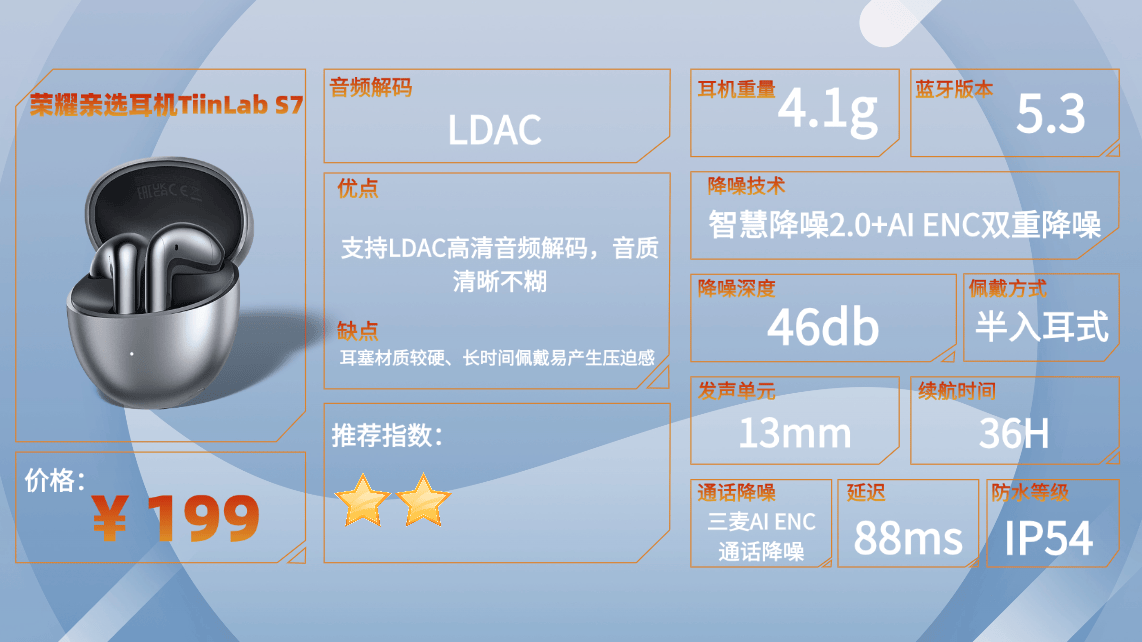 2、荣 耀亲 选耳机TiinLab S7蓝牙耳机