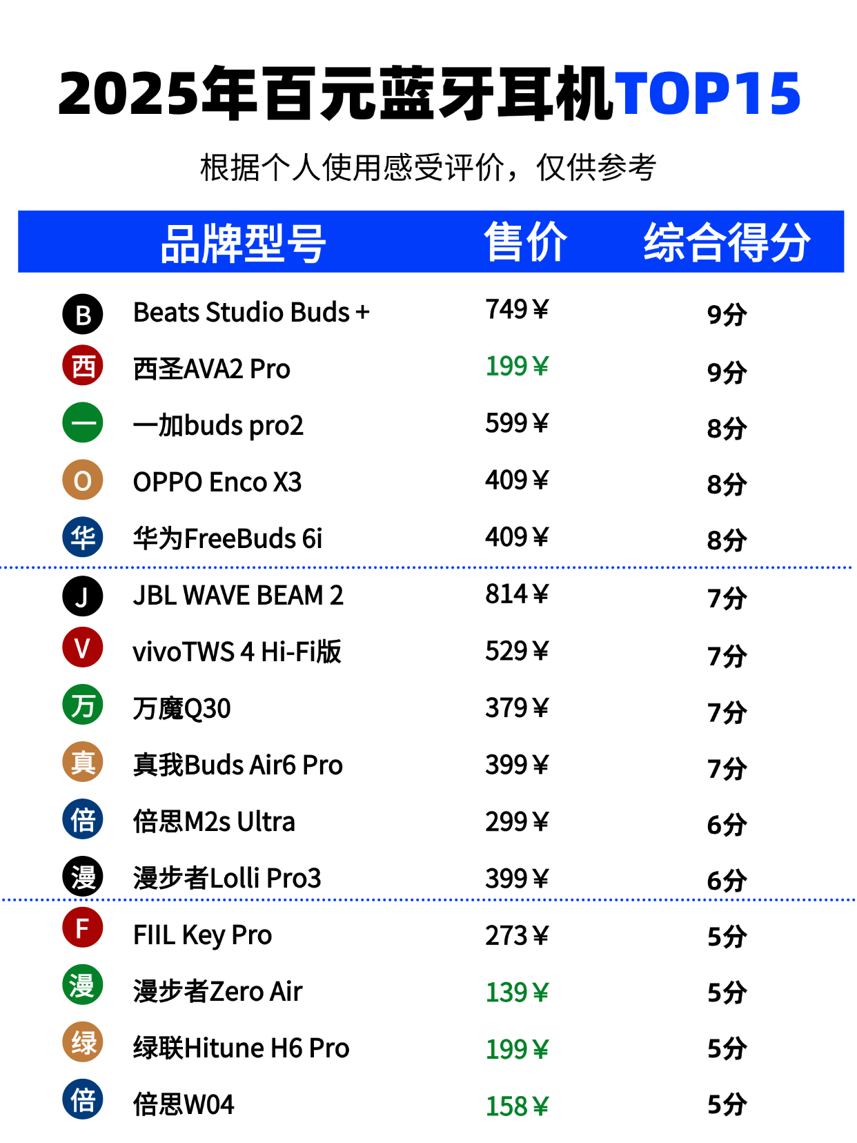 以下是我根据专业机构的测试结果整理的一张蓝牙耳机排行榜,大家也可以参考一下。