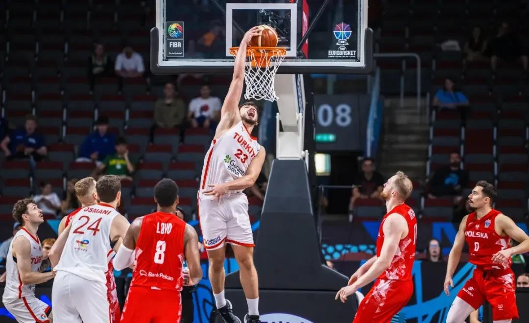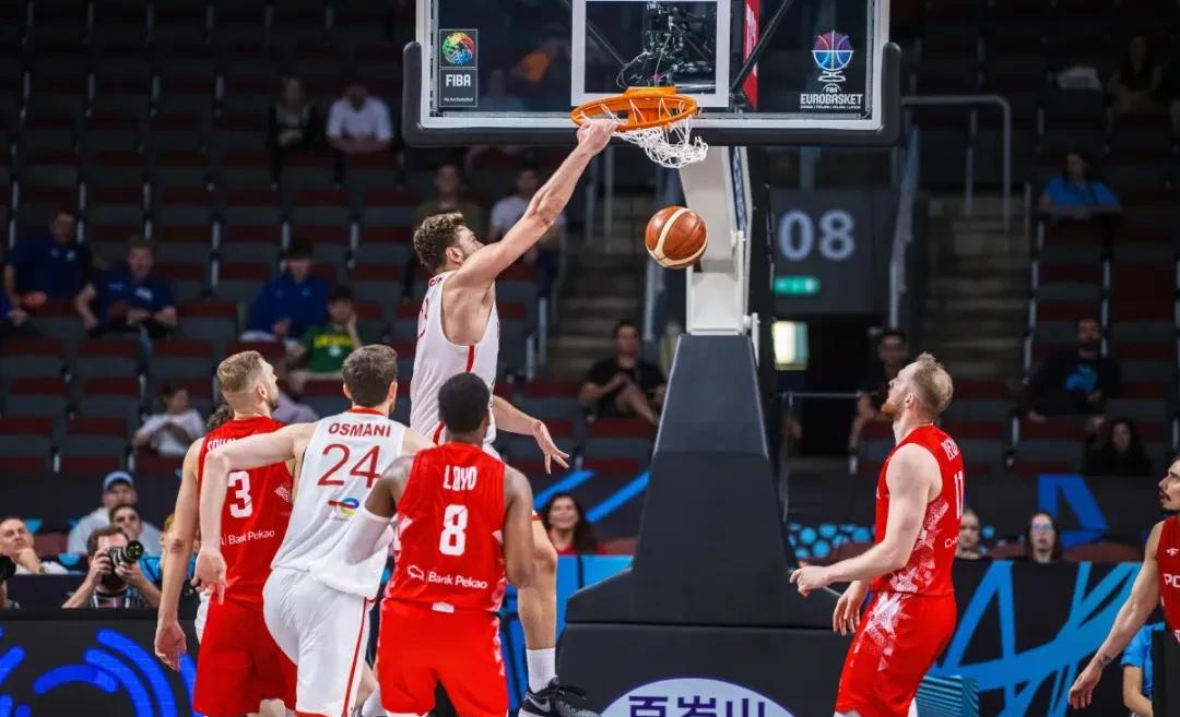 第四节末,土耳其中锋申京,一个丝滑转身抹过外线防守,又用欧洲步晃飞协防人,接着空中旋转半圈,反手扣篮命中,申京也凭借19分12板10助的成绩,成就了欧洲杯历史上第6次三双表演。