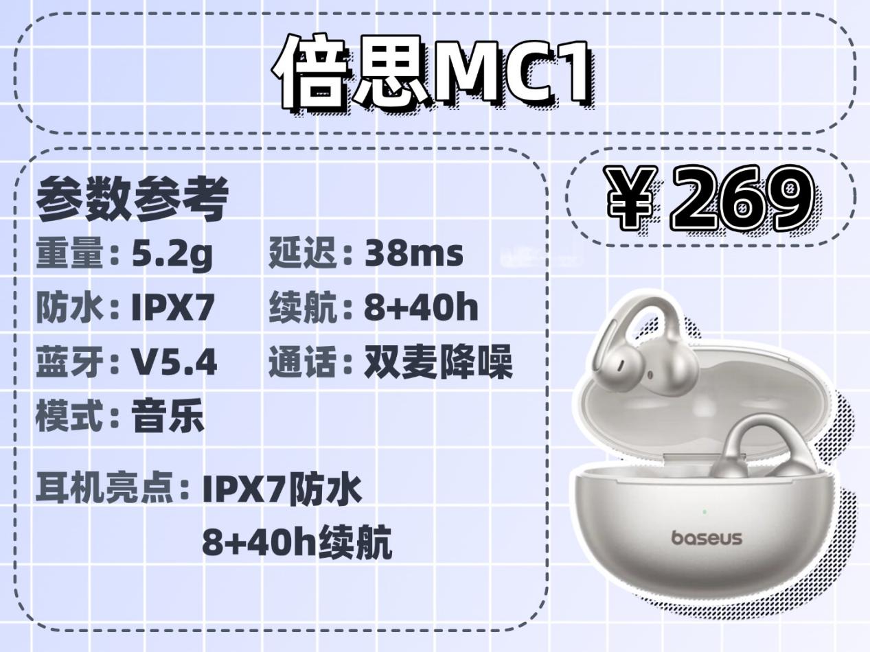 倍思MC1戴着很舒服,C形桥加气囊设计贴合耳朵,重量也轻。续航非常给力,充电一次能用好几天,防水等级高,运动出汗或小雨都不怕。不过音质比较普通,听歌没什么惊喜,而且漏音有点明显。虽然不适合对音质要求高的人,但要是看重佩戴和续航,这个价位还挺实在的。