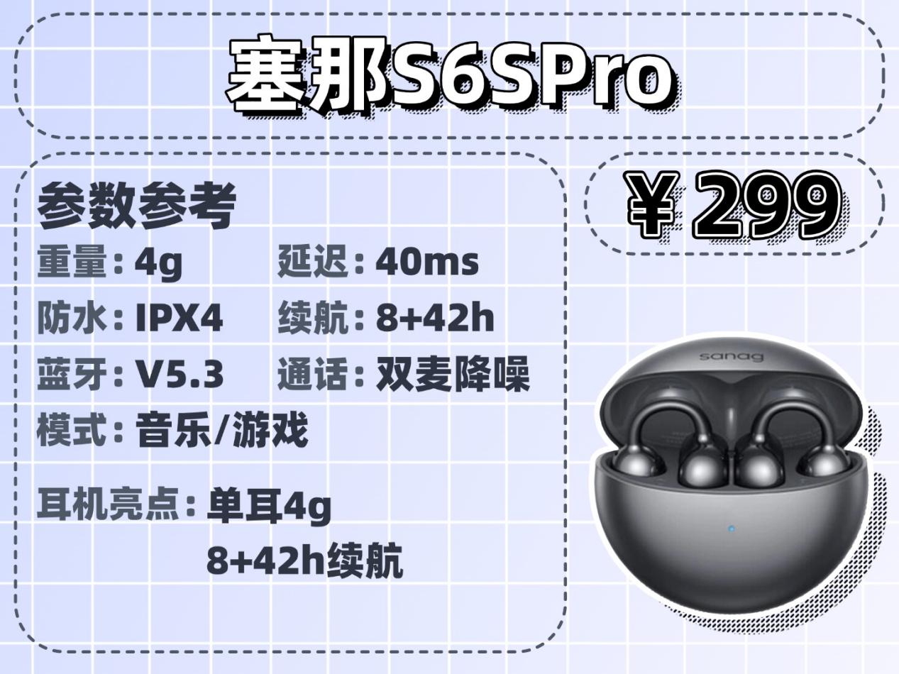 这款塞那S6S Pro戴着是真的轻,几乎无感,运动也不会掉,戴起来特别舒服。续航特别强,好几天不用充电,打游戏声音基本没延迟。不过音质就比较普通,没太多惊喜,还是很适合经常外出和游戏使用的。