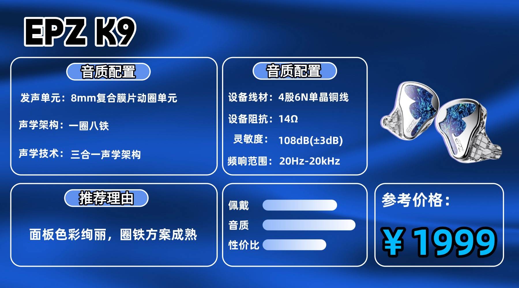 声音架构上,K9 采用一圈八铁的混合单元方案,8mm 的 PEK+PU 复合振膜动圈负责整体动态基础,信息量和规模感铺得比较完整。不过它的调音思路并不迎合“第一耳朵好听”,某些频段存在较强个性,初次上耳时容易产生风格判断分歧。声音表现对前端、耳套甚至线材的影响较为敏感,需要通过搭配来逐步找到适合自己的平衡点。标配 4 股 6N 单晶铜线,采用 0.78mm 双针接口,后期换线与升级空间充足,整体规格符合两千元档的定位。综合来看,K9 更像是一副可调型耳机,不追求即刻讨好,而是留给用户足够的探索空间,适合已经有明确听音偏好、愿意花时间调整系统的玩家。