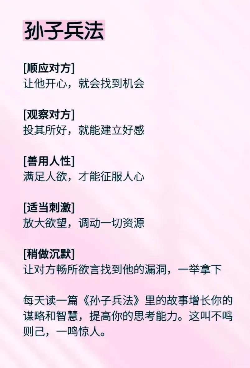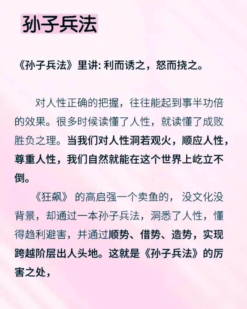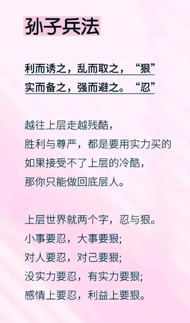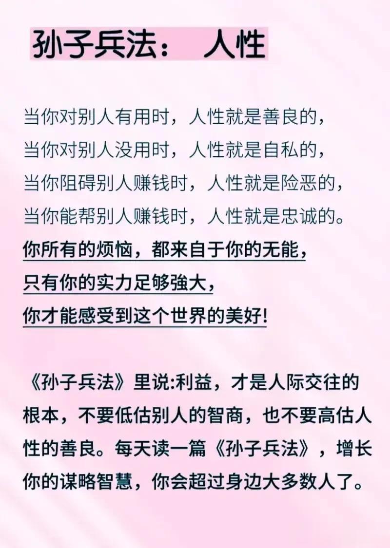 孙子兵法里说,“故善战者,求之于势,不责于人,故能择人而任势。”想要站得稳,必须要有足够硬的靠山。你会超过身边大多数的人!做人一定要有城府!你就会明白,利益,才是人际交往的根本。有一种人他天生就猛,缺乏的就是一个机遇。暗中布局,谋事先谋人,心计决定生计,人通了事就好做了,不出手则已,一出手必须是结局。不要低估别人的智商,也不要高估人性的善良。洞悉了人性,懂得趋利避害,并通过顺势、借势、造势,实现跨越阶层出人头地。