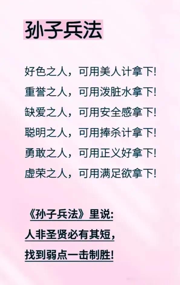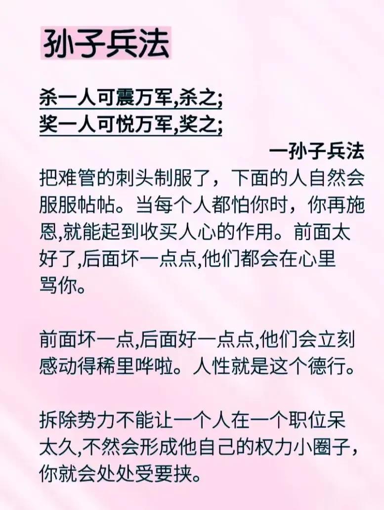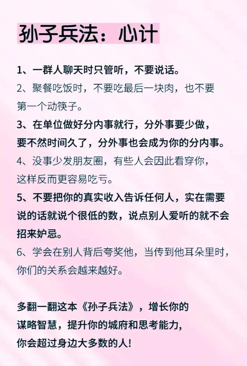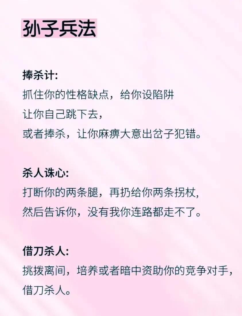 孙子兵法里说,“故善战者,求之于势,不责于人,故能择人而任势。”想要站得稳,必须要有足够硬的靠山。你会超过身边大多数的人!做人一定要有城府!你就会明白,利益,才是人际交往的根本。有一种人他天生就猛,缺乏的就是一个机遇。暗中布局,谋事先谋人,心计决定生计,人通了事就好做了,不出手则已,一出手必须是结局。不要低估别人的智商,也不要高估人性的善良。洞悉了人性,懂得趋利避害,并通过顺势、借势、造势,实现跨越阶层出人头地。