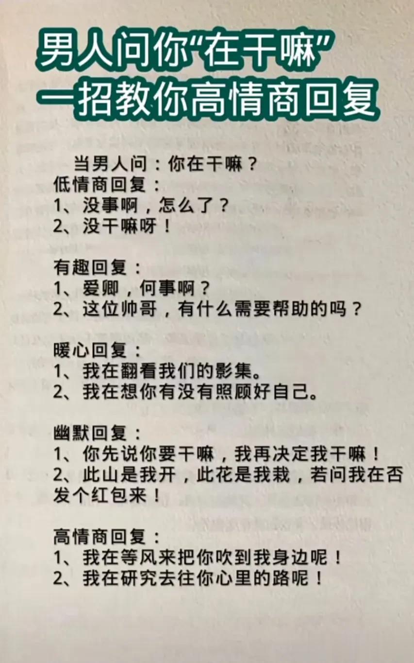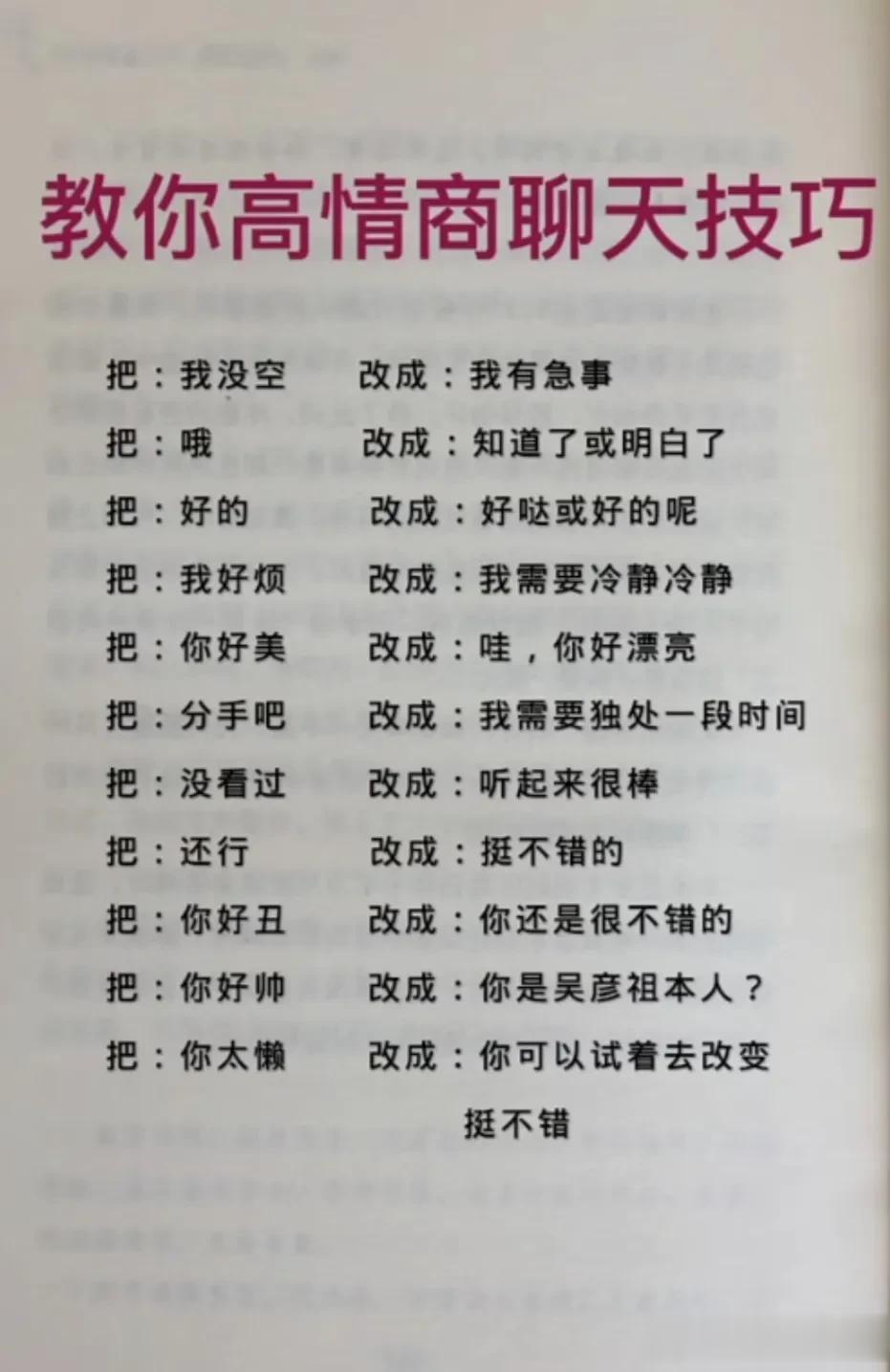 学会了高情商聊天术,高情商就是会说话,表达含蓄,幽默,学会这些高情商聊天技巧,你会提升自己的人格魅未。高情商就是换一种说法,就是开口就能说到对方的心里去,会高情商说话的人,一张嘴你就赢了。可以通过聊天来表现自己的魅力,进而来吸引到女人的目光,最终就可以得到自己想要的爱情。无论是生活上还是职场中都能左右逢源,事半功倍!你的人生就赢了。 高情商聊天术