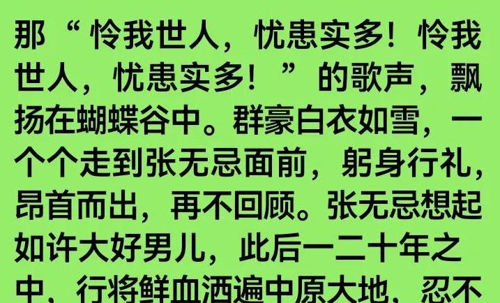 隐藏在蝴蝶谷的英雄热泪有一段情节是张无忌打动了无数读者:在蝴蝶谷中,群豪白衣如雪,纷纷走到张无忌面前躬身行礼,昂首而出不再回顾。