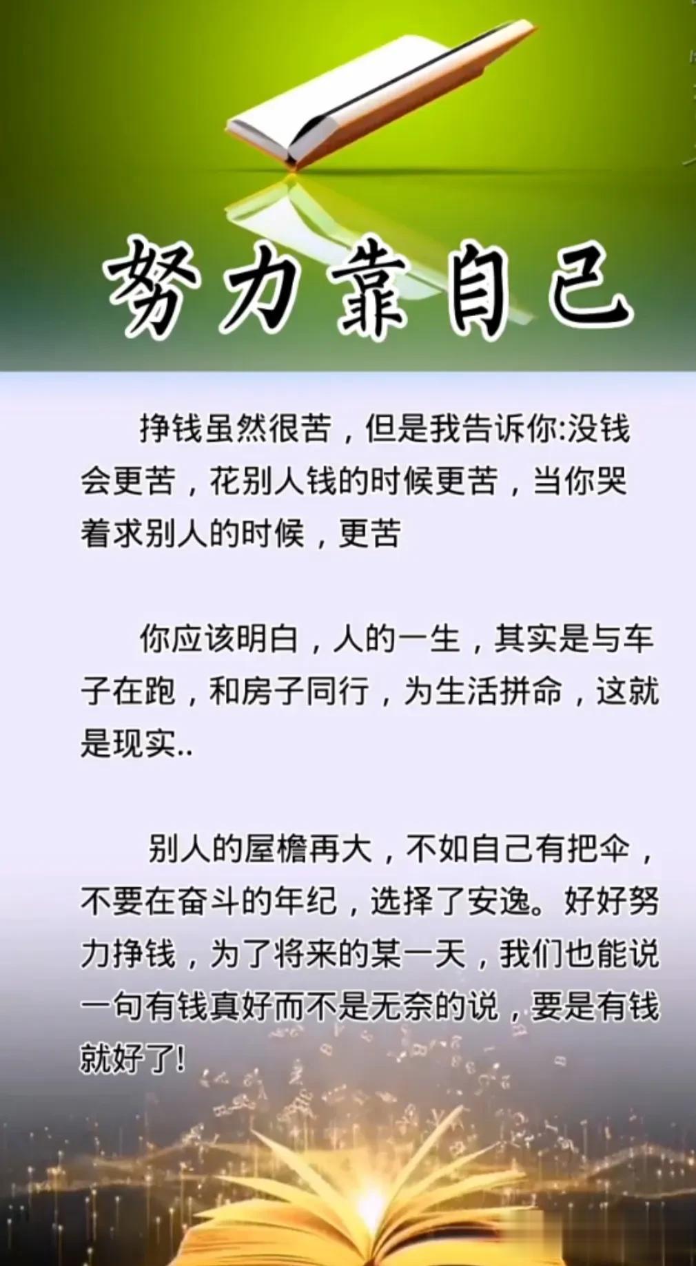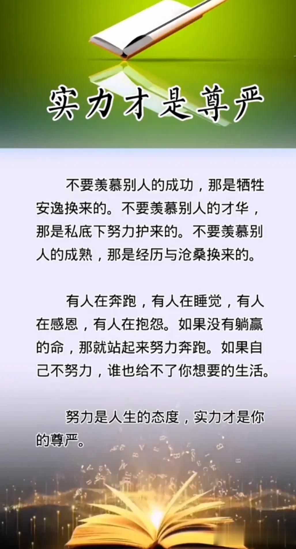 努力是人生的态度,实力才是你的尊严。滴水之可以穿石,贵在坚持,一个人不可能因为一天的努力而变好,却可以因每一天的自律而变得美好。