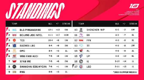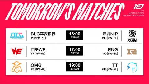 7日赛果、积分排行及今日赛程: LGD 0-2 EDG WBG 2-0 UP TES 2-1 OMG 昨天的还是很有意思的,EDG差点翻车,奈何LGD当时还没有彻底不能进季后赛,所以水鬼属性还没有完全启动,但输了EDG后正式宣告进不了季后赛了,所以之后的队伍要小心了。 第二场就没有悬念了,第三场OMH以离谱的BP输了第二局后,第三局就完全没有气势了,下路差距太大了。 昨天的比赛结束,OMG、WBG正式进入季后赛,而LGD正式失去季后赛资格。 第一名还是BLG,LGD也稳坐排行榜倒数第一。 今天依旧是三场比赛 2023LPL夏季赛7月8日首发名单 15:00 BLG vs NIP 17:00 WE vs RNG 19:00 OMG vs TT 六支队伍都没有人员变动,BLG目前的状态拿下NIP肯定是没啥问题的。最有看点的还是RNG对战WE,不是因为强,而是大家都在争夺季后赛资格,俩队胜负场接近,所以都很重要。 而昨天输了的OMG今天又有比赛,TT最近状态火热,OMG如果状态不能及时调整,也是有危险的哦。