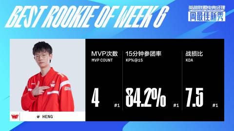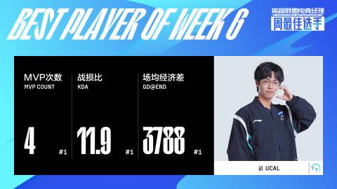 2023LPL夏季赛第六周最佳阵容: 上单——BLG.Bin 打野——WE.Heng 中单——TT.ucal ADC——BLG.Elk 辅助——WBG.Crisp 第六周MVP选手——TT.ucal 第六周最佳新秀——WE.Heng