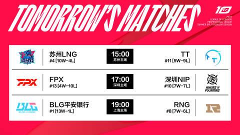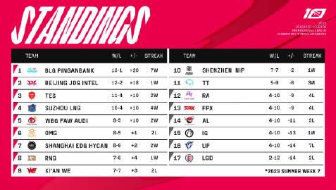今日赛果、积分排行以及明日赛程: UP 0-2 TES WE 0-2 JDG 好好的三场比赛,让腾竟游戏服爆炸给炸成了两场,OMG的挪到下周一三点场去了,OMG粉丝和AL粉丝不仅付出了金钱和时间,下周的票都卖光了也去现场看不了了。 今天的比赛还是老样子,UP打野ning尽力了,下路纯在拖后腿,doggo从去年到今年换了三个辅助都不行,只能说明是他不行,这两年AD位确实青黄不接。 而WE,今天过了三十分钟就开始发疯,两场都有机会赢下来,但每次打龙决策都出问题,特别是第二把,heng已经很尽力了,在下路大劣势情况下,硬生生蹲出了优势,太可惜了。 今天比赛没啥太大影响。 明天依旧是三场比赛 2023LPL夏季赛7月12日首发名单 15:00 LNG vs TT 17:00 FPX vs NIP 19:00 BLG vs RNG 六支队伍都没有进行人员更换。 明天比赛看点,一是TT能不能以下克上?毕竟TT最近状态太好了,还是值得期待一手。 第二就是NIP能不能战胜FPX?战胜了就能进季后赛,输了还要打LNG,比FPX机会小。 第三就是lvmao和on的辅助之争,春季赛后半段多亏了又lvmao替补,ON终于打得正常了,所以两位辅助的对决还是值得一看的。 希望明天比赛服别崩了谢谢!
