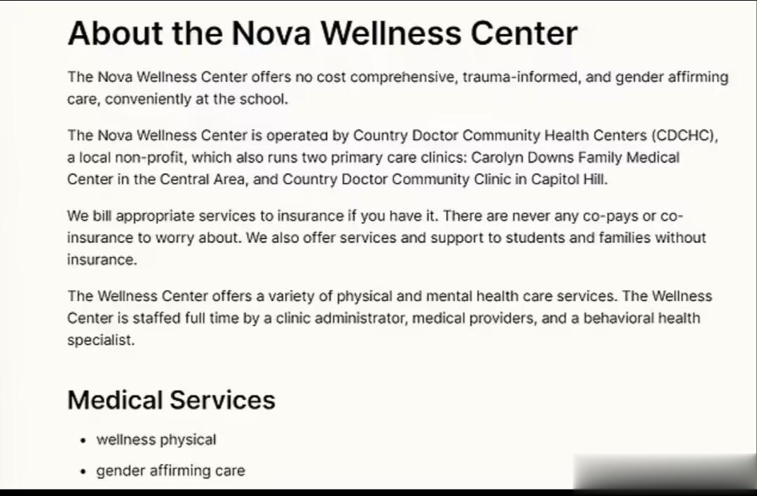 新星健康的网站并没有具体说明“性别确认护理”的含义。这两个中心的提供者,乡村医生社区卫生中心声称为青少年提供激素治疗和变性手术。